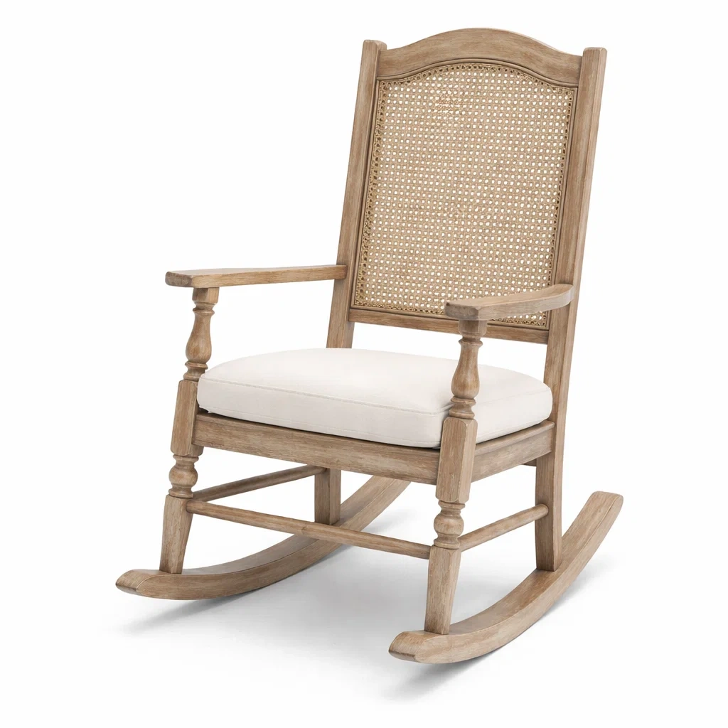 Sedia a dondolo in legno massello con schienale in rattan