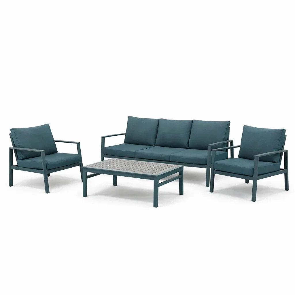 Set di divani da giardino in alluminio con braccioli in legno e cuscini in poliestere grigi