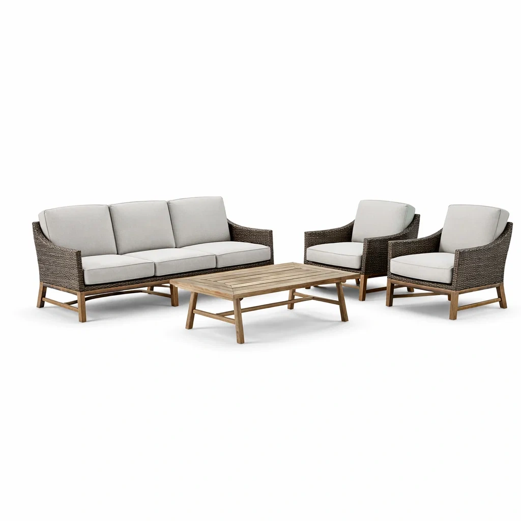 Prodotti inclusi: divano a tre posti, 2 poltrone, tavolino, cuscini.