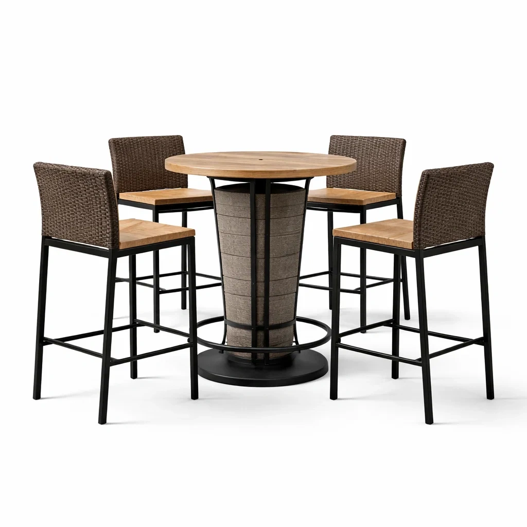 Il colore predominante del tavolo è il legno naturale, con sgabelli in rattan marrone e struttura nera. La costruzione offre impermeabilità e resistenza agli agenti atmosferici.